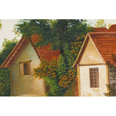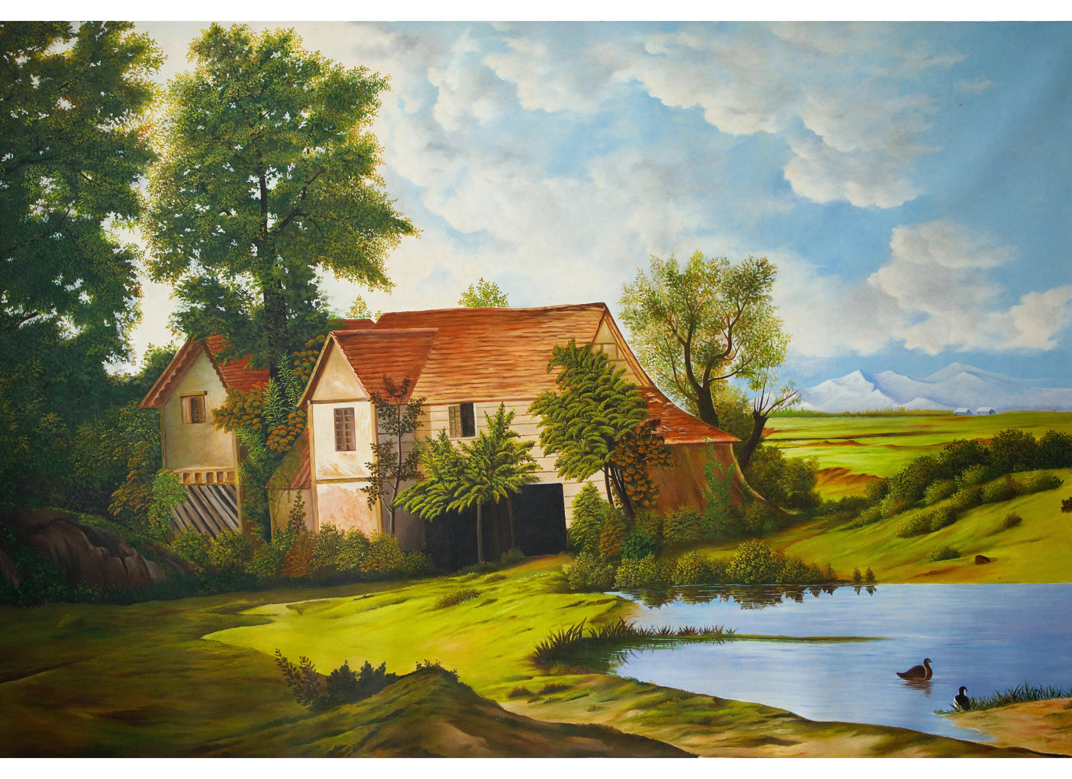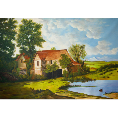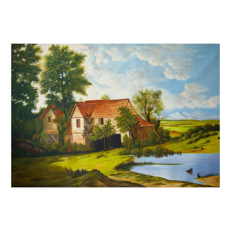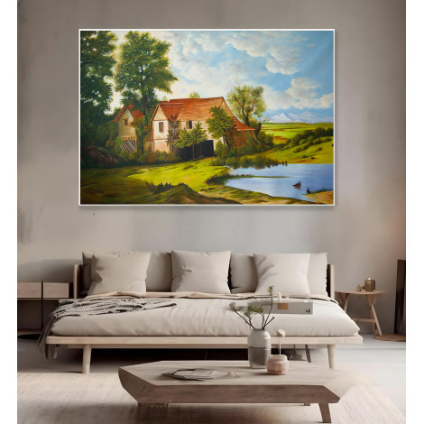 Bring home the charm of rustic tranquility with this stunning canvas oil painting. The artwork beautifully captures a peaceful countryside cottage nestled among lush greenery, with a serene lake reflecting the soft hues of nature. The clear blue sky, majestic distant mountains, and the gentle presence of ducks on the water create a soothing, idyllic scene that radiates calmness and harmony. The artist’s meticulous brushwork highlights every detail—from the texture of the roof tiles to the graceful flow of the trees—offering both depth and realism. Perfect for living rooms, bedrooms, offices, or studios, this painting adds warmth and serenity to any space. More than just wall décor, it is a window into the beauty of simple rural life, inviting you to escape into nature’s embrace.