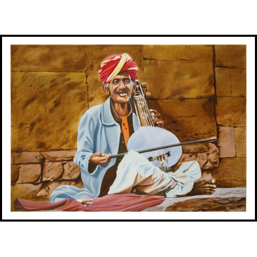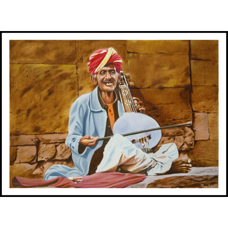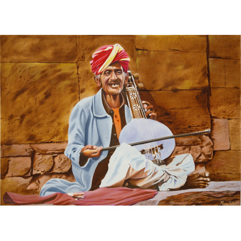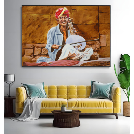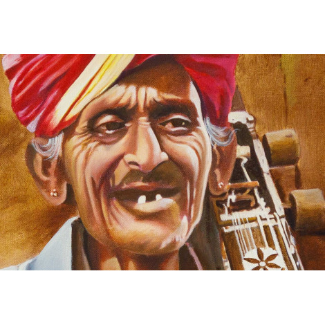 Bring home the soulful charm of Rajasthan with this captivating canvas oil painting titled “Sound of Soul.” The artwork beautifully portrays a traditional Rajasthani musician, dressed in vibrant attire, playing the sarangi with heartfelt expression. The rustic sandstone backdrop and earthy tones perfectly contrast with the musician’s colorful turban and serene smile, evoking a sense of timeless culture and tradition. Painted with fine brushwork and realistic detailing, this piece radiates warmth, joy, and the spirit of Indian folk heritage. Whether placed in your living room, office, or art collection, this painting creates an inviting ambiance filled with positivity, music, and cultural richness. It is not just art—it is a celebration of soulful melodies and the vibrant essence of Rajasthan.