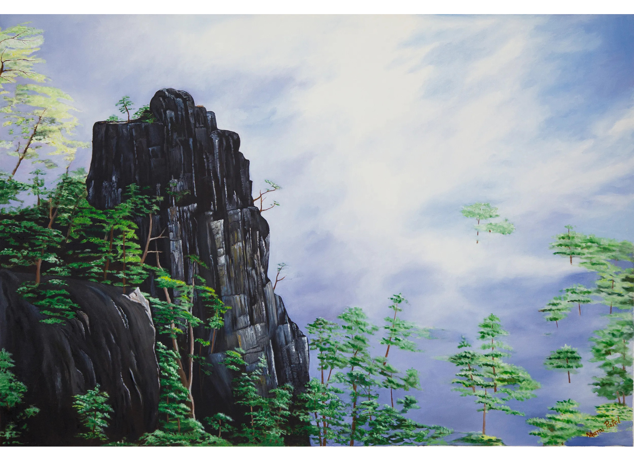 "The King of Loneliness" एक अद्वितीय कैनवास ऑयल पेंटिंग है जो प्रकृति की भव्यता और एकाकीपन की शक्ति को बखूबी दर्शाती है। गहरे रंगों से सजी विशालकाय चट्टान साहस और दृढ़ता का प्रतीक है, जबकि चारों ओर फैले हरे-भरे चीड़ के वृक्ष वातावरण में शांति और ताजगी का संचार करते हैं। आकाश में बहते हल्के बादल इस दृश्य को और भी स्वप्निल बनाते हैं, जहाँ धरती और आकाश का अद्भुत संगम दिखाई देता है। कलाकार की सूक्ष्म कूची-कला चट्टानों की बनावट से लेकर धुंध की परतों तक हर विवरण को जीवंत बना देती है। यह पेंटिंग न केवल आपके घर या ऑफिस की शोभा बढ़ाएगी बल्कि आत्मबल और आंतरिक शांति का एहसास भी कराएगी। कला प्रेमियों और संग्राहकों के लिए यह एक सदाबहार उत्कृष्ट कृति है।