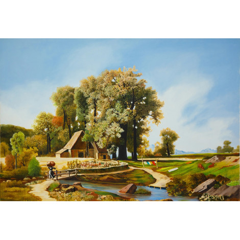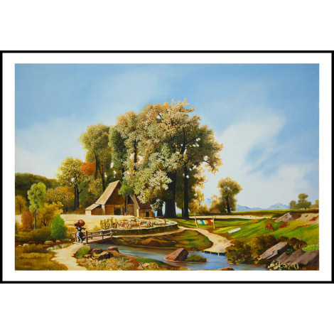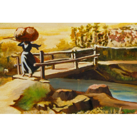Bring home the timeless beauty of rural life with this exquisite canvas oil painting, “In The Farm.” The artwork captures a peaceful countryside scene with lush green fields, towering trees, a gentle stream, and a rustic farmhouse surrounded by nature. Soft earthy tones blend with vibrant greens and blues, creating a soothing balance that radiates calmness and serenity. The detailed brushstrokes highlight every element — from the wooden bridge and flowing water to the distant grazing animals — making the scene feel alive. Perfect for living rooms, bedrooms, or office spaces, this painting invites viewers into a world of tranquility and rustic charm. It is not just a painting but a piece of nature’s poetry on canvas, designed to uplift your decor and bring a refreshing sense of peace to your home or workspace.