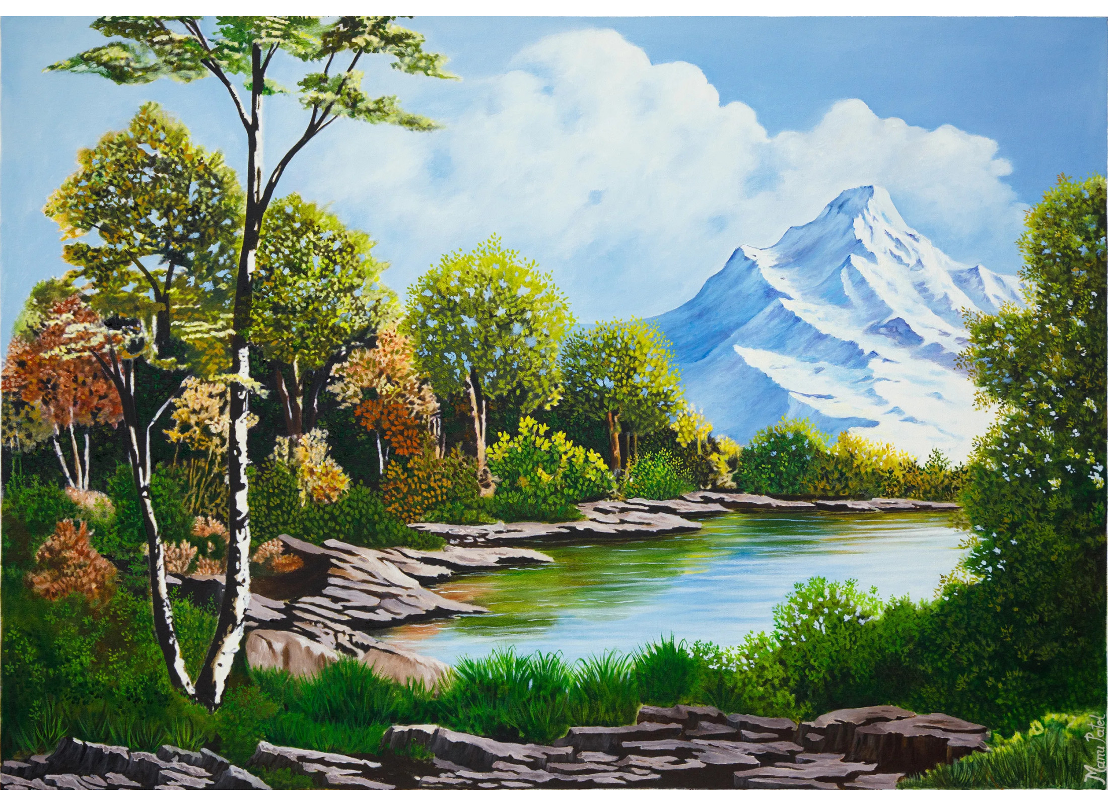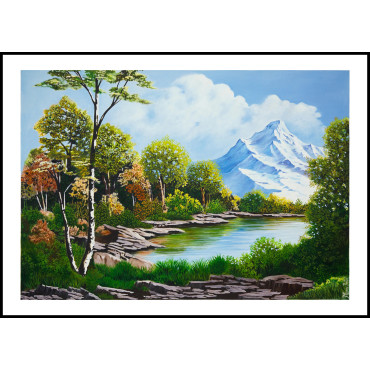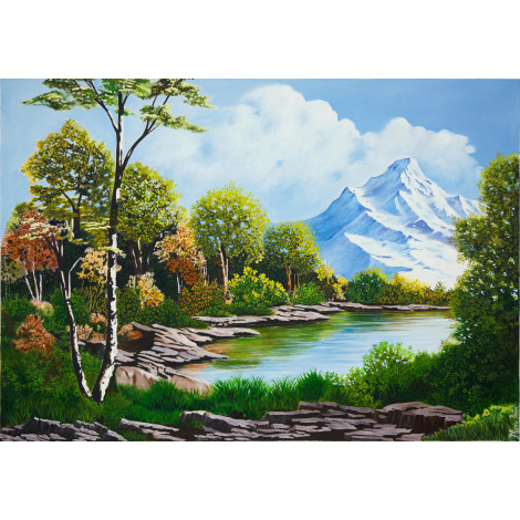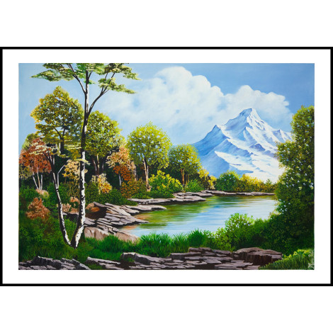 Bring the serenity of nature into your space with this stunning canvas oil painting, featuring a crystal-clear lake surrounded by lush green trees and the majestic presence of snow-clad mountains. The artist has beautifully captured the harmony of earth, water, and sky, blending vibrant greens, earthy browns, and calming blues to create a peaceful composition. Each brushstroke adds depth and realism, making you feel as if you are standing beside the still waters, breathing in fresh mountain air. Perfect for living rooms, offices, or bedrooms, this artwork infuses your surroundings with calm, balance, and inspiration. A timeless piece of wall art, it is ideal for those who love nature and wish to bring its beauty indoors.