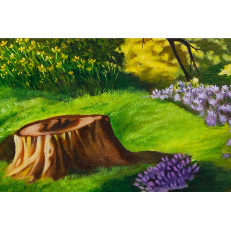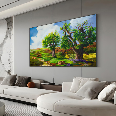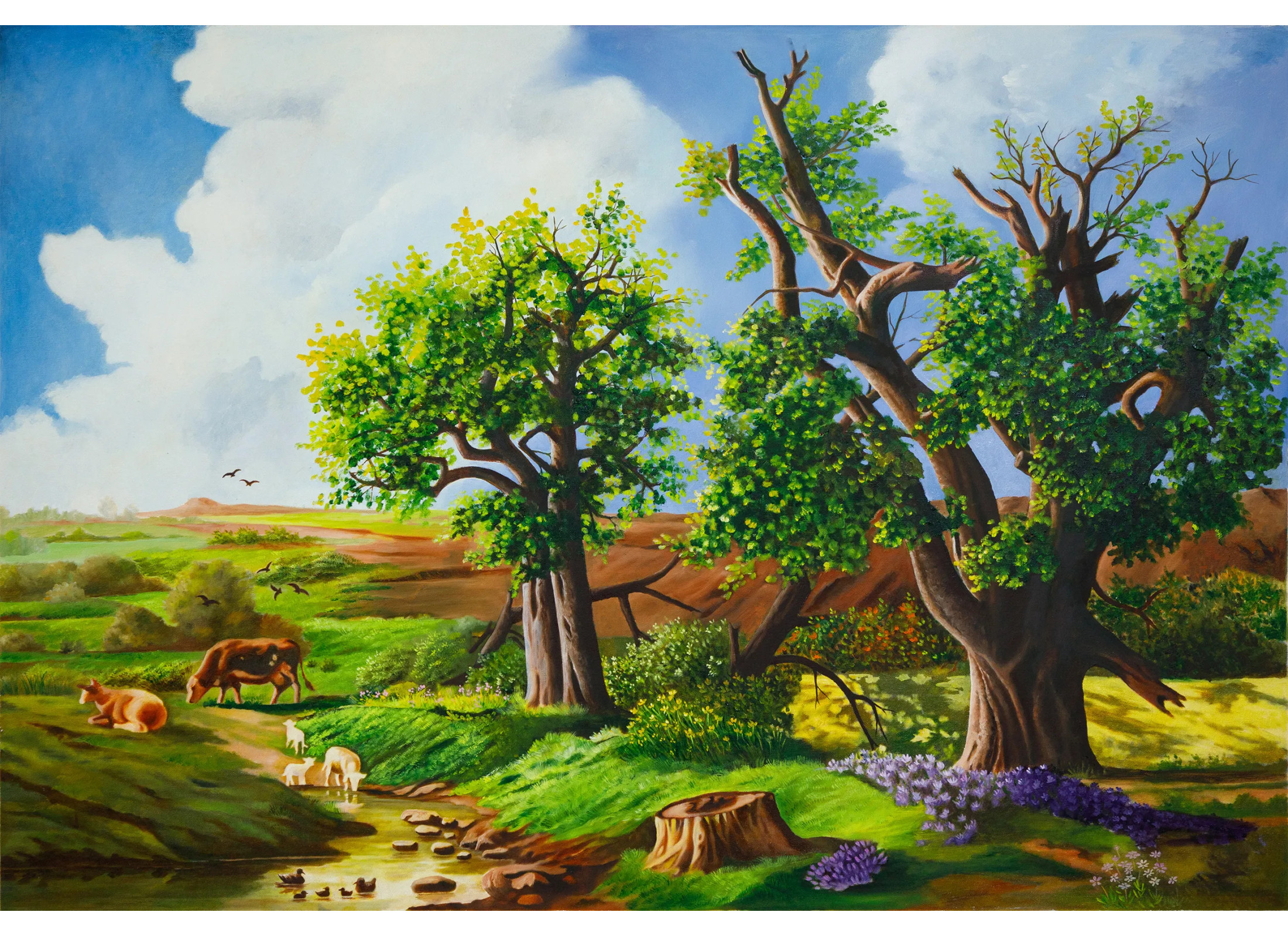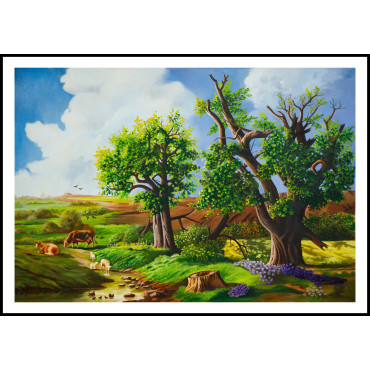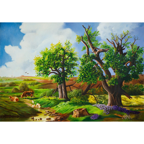 Bring home the serenity of nature with “The Depth of Nature”, a captivating canvas oil painting that reflects the timeless beauty of a lush countryside. The artwork portrays towering trees with vibrant green foliage, a peaceful stream flowing gently, and grazing cattle enjoying the calm surroundings. The soft blue sky and golden sunlight create a soothing balance of warmth and freshness. Each brushstroke highlights the depth of rural tranquility, making this painting an ideal centerpiece for your living room, office, or study. Whether you want to add natural harmony to your home decor or gift someone a masterpiece of peace and positivity, this oil painting is a perfect choice. Its lifelike detailing and vibrant colors will instantly elevate any space with a touch of elegance and calmness.