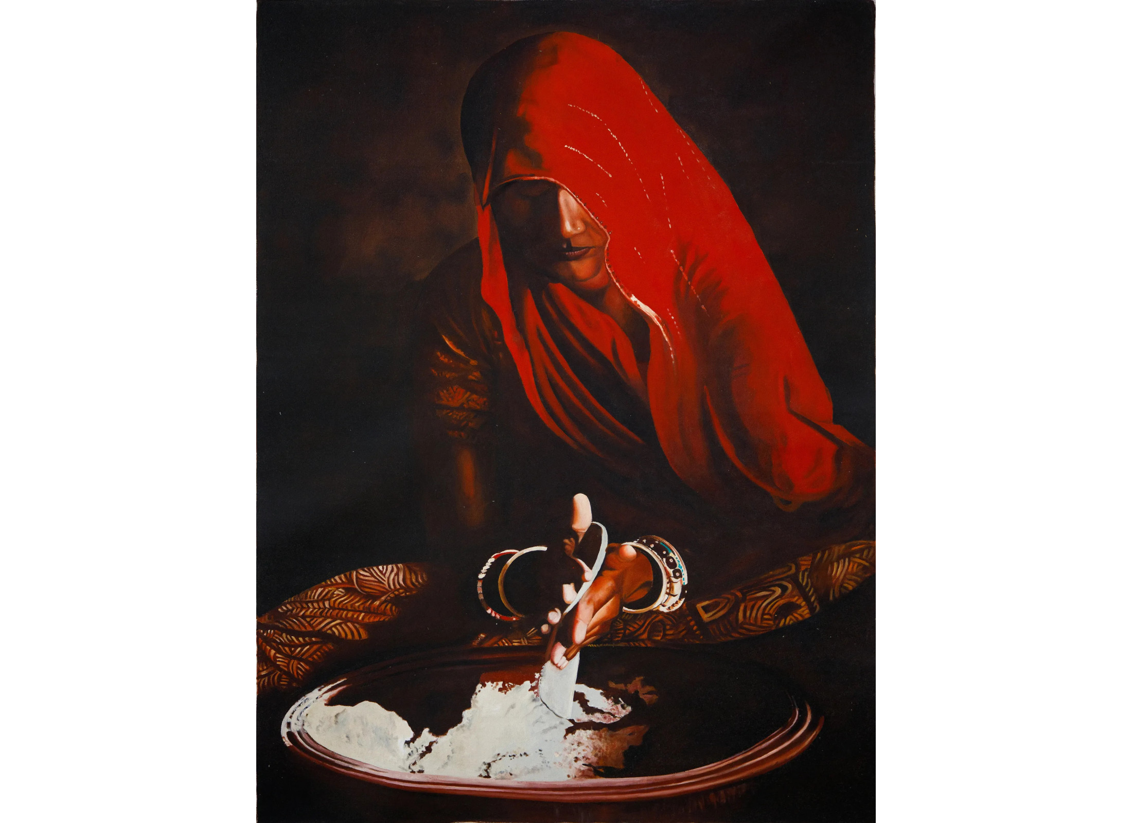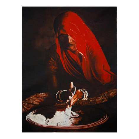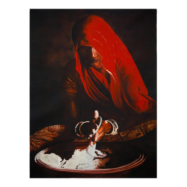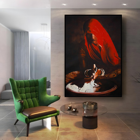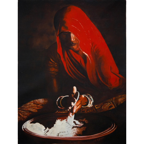 This stunning oil-on-canvas painting captures the timeless beauty of Indian tradition through the soulful portrayal of a woman draped in a radiant red saree. Her half-covered face under the veil reflects modesty, mystery, and grace, while the soft play of light and shadow creates a deeply emotional aura. The artist skillfully highlights her delicate hand movements as she works with flour, symbolizing simplicity, devotion, and the everyday strength of rural women. The earthy tones combined with the vibrant red create a striking contrast that adds warmth and depth to any room. Perfect for living rooms, offices, or art galleries, this masterpiece not only enhances your space but also evokes a sense of cultural richness, humility, and connection to heritage. A true conversation starter, this artwork celebrates the beauty of tradition and feminine resilience.