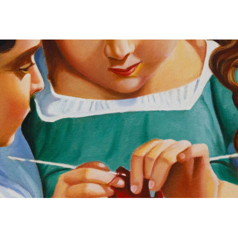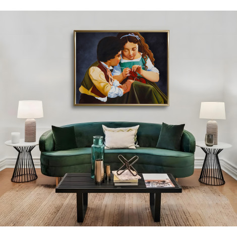 This exquisite canvas oil painting, titled “The Love”, beautifully captures the innocence and warmth of childhood companionship. Depicting a tender moment between two children engrossed in a shared activity, the artwork radiates affection, care, and unspoken trust. The artist’s use of deep, earthy tones and rich brushwork creates a timeless and nostalgic atmosphere, while the detailed expressions highlight the purity of young emotions. The contrast of vibrant fabrics against a muted background enhances the central theme of love and connection. Ideal for home interiors, living rooms, or art collectors seeking a meaningful piece, this painting not only decorates a space but also evokes heartfelt emotions. A true testament to the enduring beauty of human bonds, it stands as a masterpiece of traditional oil artistry.