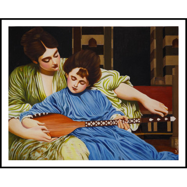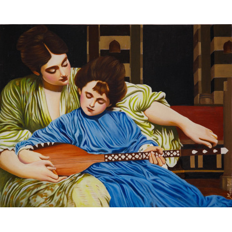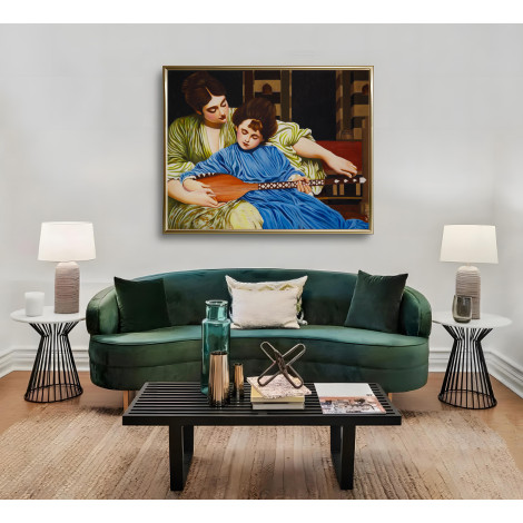 This exquisite canvas oil painting beautifully captures the timeless theme of innocence and guidance. The artwork portrays a serene moment between a mother and child, where the mother gently teaches the young one to play a lute. The child’s calm expression, highlighted in a flowing blue garment, symbolizes purity and innocence, while the mother’s tender presence in soft green tones reflects nurturing love. The warm, detailed brushwork and realistic style bring depth and emotional richness, making this piece a true celebration of family, harmony, and artistry. Perfect for art lovers and collectors, this painting not only enhances interiors but also evokes a heartfelt emotional connection with viewers.