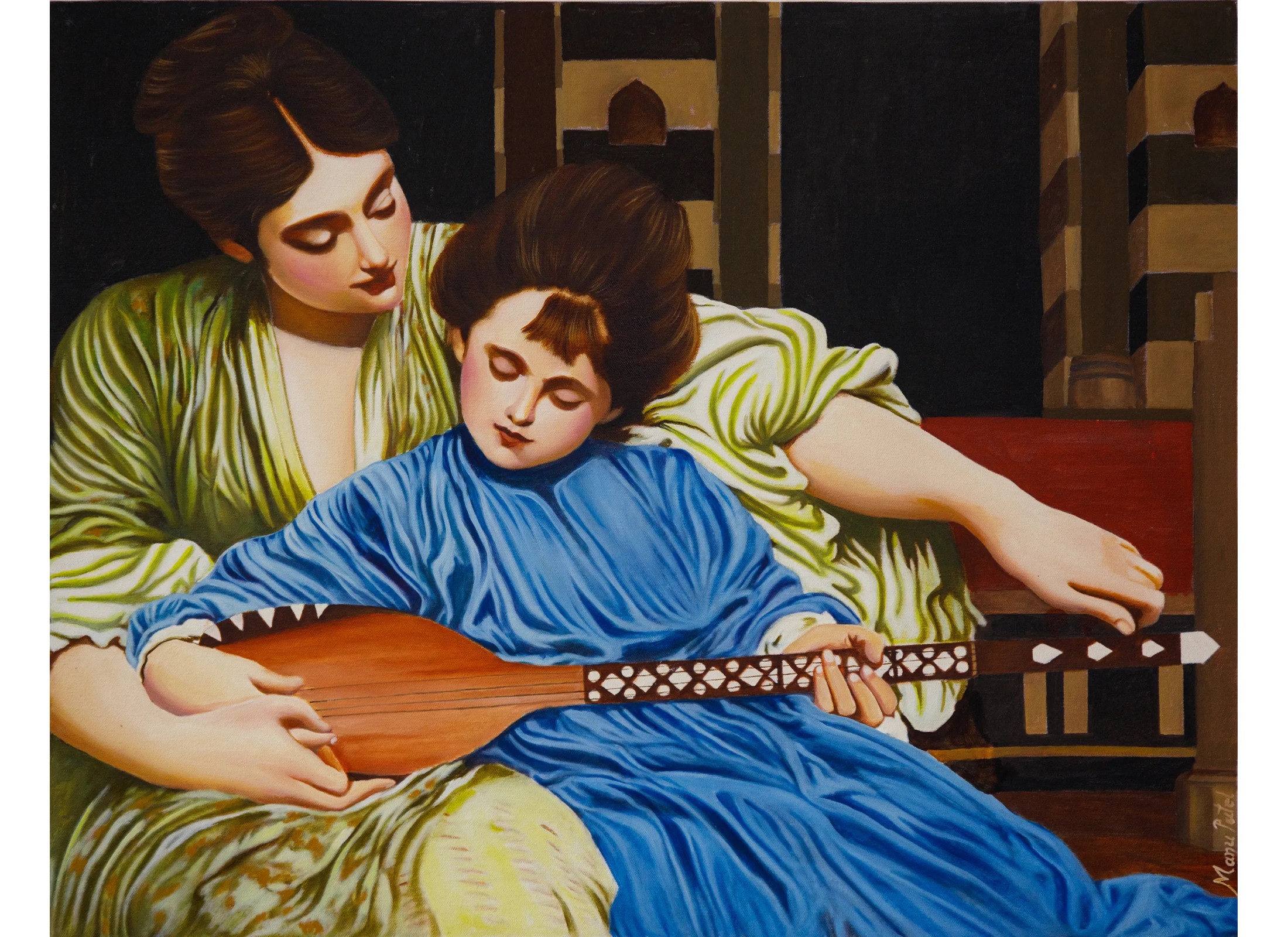 यह सुंदर कैनवास ऑयल पेंटिंग मासूमियत और मार्गदर्शन के शाश्वत विषय को अद्भुत तरीके से दर्शाती है। चित्र में माँ और बच्चे का कोमल क्षण दिखाई देता है, जहाँ माँ प्रेमपूर्वक बच्चे को वीणा (वाद्य यंत्र) बजाना सिखा रही है। नीली पोशाक में शांत भाव लिए बच्चा मासूमियत का प्रतीक है, वहीं हरे रंग की नरम आभा में माँ का स्नेहिल स्पर्श मातृत्व और देखभाल को दर्शाता है। गहन ब्रशवर्क और यथार्थवादी शैली इस कला को गहराई और भावनात्मकता प्रदान करते हैं। यह पेंटिंग परिवार, सामंजस्य और कला का सुंदर संगम है, जो किसी भी इंटीरियर को शांति और सुंदरता से भर देती है।