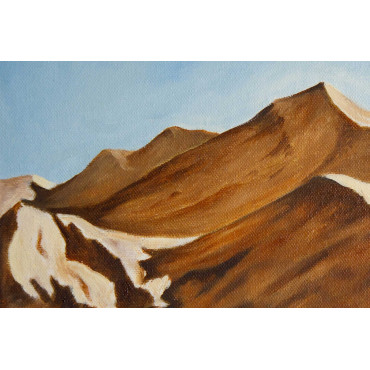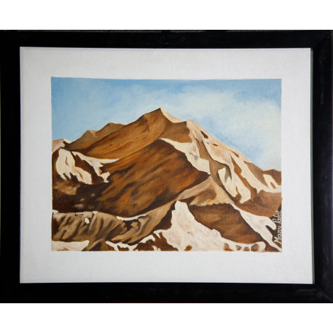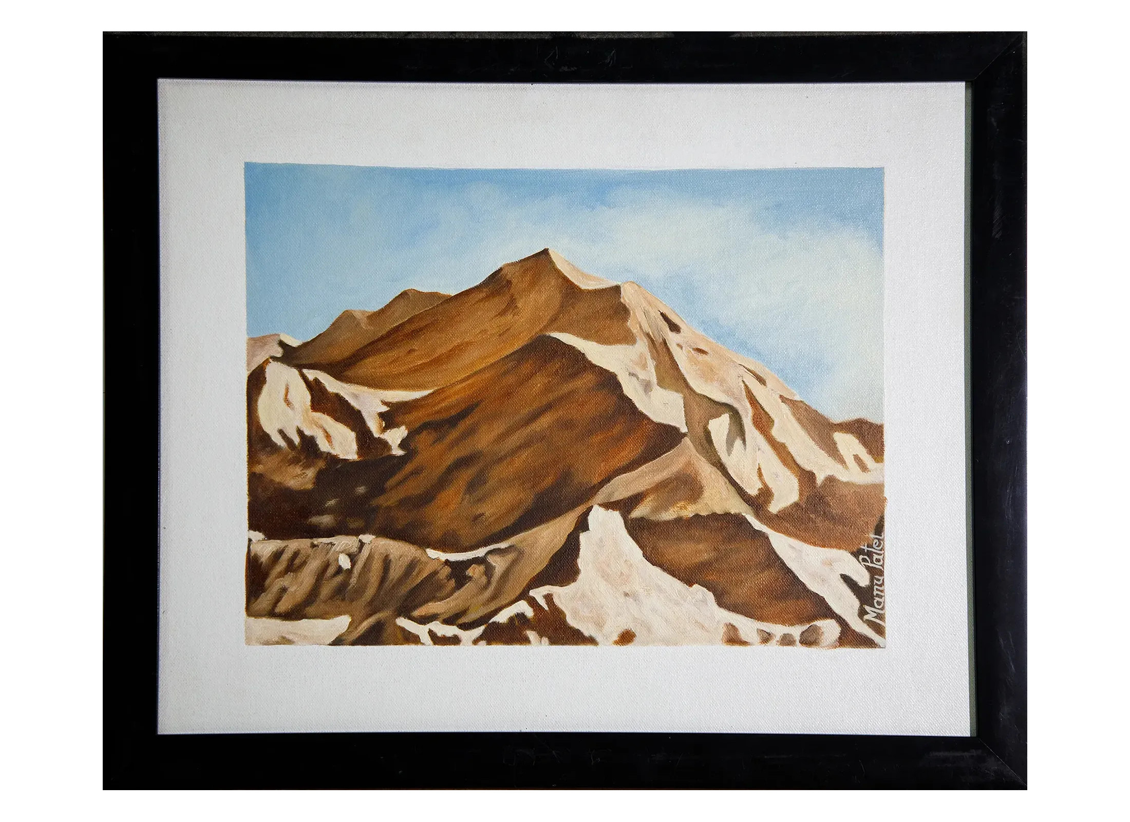 This captivating canvas oil painting showcases the raw beauty and enduring strength of towering mountains, symbolizing resilience and hardness. The artist skillfully blends earthy browns with hints of white snow, bringing out the rugged textures of rocky peaks against a soft blue sky. The bold strokes and natural color palette evoke a sense of stability, perseverance, and timeless grandeur, making it a powerful statement piece for any interior. Perfect for nature lovers and art collectors, this mountain painting not only enhances wall decor but also inspires inner strength and calmness. Add this masterpiece to your home or office to bring the spirit of the Himalayas into your space.