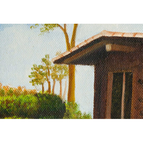 This exquisite canvas oil painting captures the timeless charm of a rustic stone cottage embraced by nature. The play of light and shadow brings life to the scene, where warm sunlight gently filters through the trees, casting soft silhouettes across the grass. The earthy tones of the cottage blend harmoniously with the lush greenery, while subtle hints of orange and red flowers add vibrancy to the composition. Painted in a realistic yet serene style, this artwork evokes feelings of peace, nostalgia, and connection with the outdoors. Perfect for home, office, or gallery décor, it creates a calming atmosphere while showcasing the artist’s keen attention to detail. This masterpiece is ideal for collectors and art enthusiasts who appreciate landscapes that capture the essence of light, shade, and nature’s beauty.