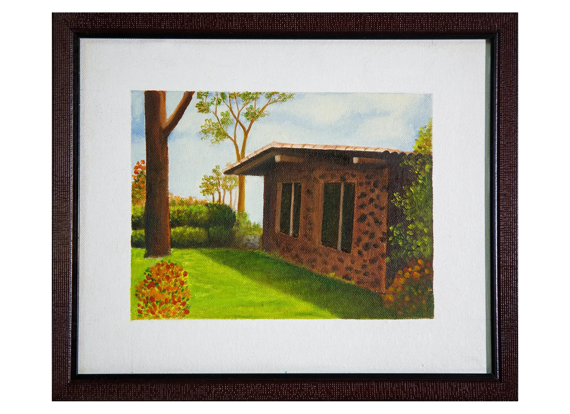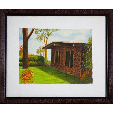 यह सुंदर कैनवास ऑयल पेंटिंग एक देहाती पत्थर के कॉटेज की प्राकृतिक सुंदरता को दर्शाती है। पेड़ों से छनकर आती धूप और उसके बीच उभरती छाया पूरे दृश्य में जीवन का स्पर्श लाती है। हरे-भरे पेड़-पौधे और कॉटेज के मिट्टी जैसे रंग आपस में सामंजस्य बनाते हैं, वहीं नारंगी और लाल फूलों की झलक चित्र में जीवंतता भर देती है। यथार्थवादी शैली में बनाई गई यह पेंटिंग शांति, सुकून और प्रकृति के साथ जुड़ाव का एहसास कराती है। घर, ऑफिस या गैलरी की दीवारों पर सजाने के लिए यह कलाकृति आदर्श है और इसे देखने वाला हर व्यक्ति इसकी बारीकियों और भावनाओं से प्रभावित होता है।