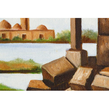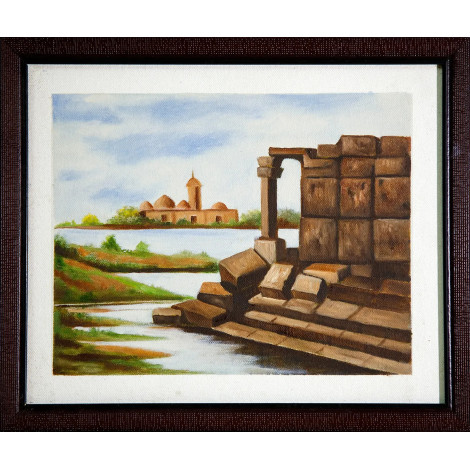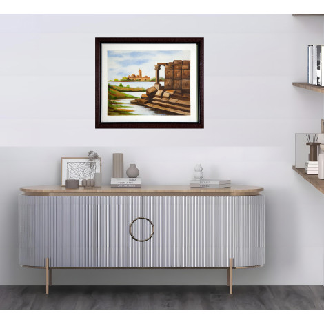 This exquisite oil painting on canvas beautifully captures the essence of old age and timeless heritage. The artwork portrays the rustic ruins of ancient stone architecture by the riverside, symbolizing strength, endurance, and the passage of time. In the background, a serene temple complex stands gracefully under a calm sky, reflecting a deep sense of peace and spiritual connection. The warm earthy tones of the stones blend harmoniously with the soft blues and greens of nature, creating a balanced composition that evokes nostalgia and reverence for history. Perfect for art collectors, heritage lovers, or anyone who values cultural depth, this canvas painting adds a touch of elegance and timeless charm to any living space.