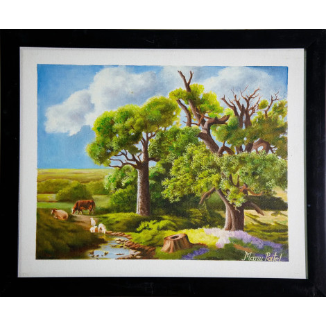 “वसंत का स्वागत” शीर्षक वाली यह सुंदर कैनवास ऑयल पेंटिंग प्रकृति के नवजीवन की झलक प्रस्तुत करती है। हरे-भरे पेड़, नीले आकाश और शांत घास का मैदान इस चित्र में जीवन्तता भरते हैं। एक स्वच्छ जलधारा के किनारे चरते हुए जानवर इस दृश्य को और भी यथार्थपूर्ण बनाते हैं। हरियाली के जीवंत रंग, मिट्टी के गहरे शेड और फूलों की नाजुक आभा वसंत ऋतु की ऊर्जा और सौंदर्य को बखूबी दर्शाते हैं। सूक्ष्म ब्रश स्ट्रोक्स और यथार्थवादी शैली में बनी यह पेंटिंग घर या कार्यालय की दीवारों के लिए एक आकर्षक सजावट है। यह आपके वातावरण में शांति, ताजगी और सकारात्मकता का संचार करती है।