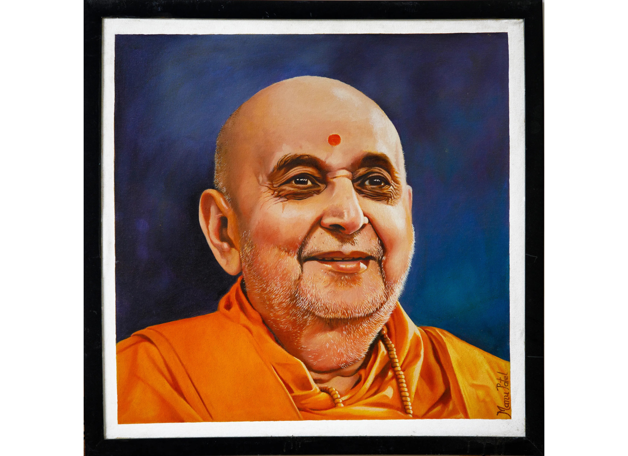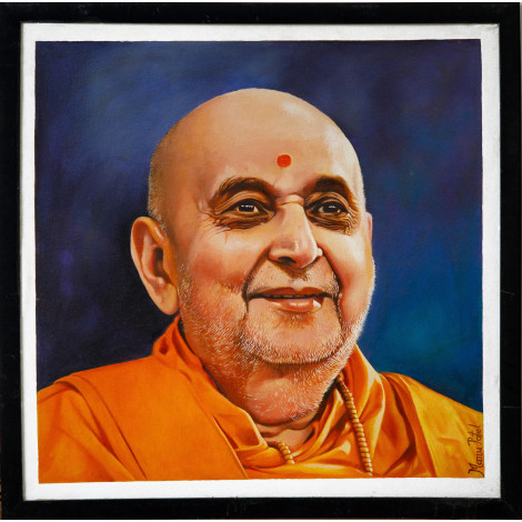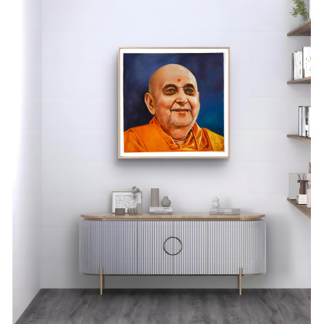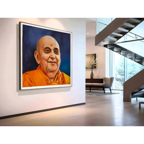 This exquisite canvas oil painting of Pramukh Swami Maharaj beautifully captures the serene presence and divine aura of the revered spiritual leader. The artist has skillfully highlighted his warm smile, gentle expression, and radiant personality, reflecting peace, wisdom, and compassion. Set against a deep, calming background, the painting contrasts vibrantly with the bright saffron attire, symbolizing purity and devotion. Each brushstroke brings out the depth of his kind eyes, making this artwork not just a portrait, but a soulful representation of spiritual enlightenment. Perfect for meditation spaces, living rooms, or gifting, this painting adds an aura of positivity, devotion, and inspiration to any environment. A timeless masterpiece for followers and art admirers alike.