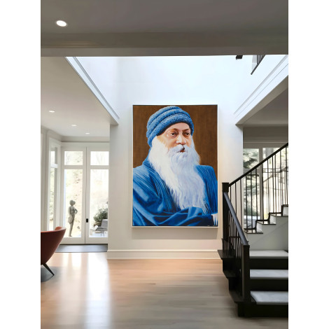 This exquisite handmade canvas oil painting beautifully captures the serene presence of Osho, the renowned spiritual teacher and philosopher. Painted with meticulous detail, the artwork highlights his thoughtful expression, flowing white beard, and signature blue attire, symbolizing peace, clarity, and enlightenment. The warm earthy background contrasts harmoniously with the cool tones of blue, enhancing the subject’s aura of wisdom and calmness. Crafted in a realistic style, this painting radiates meditative energy and is ideal for spiritual seekers, art collectors, or anyone looking to add a sense of tranquility and inspiration to their living space. Displaying this masterpiece in your home, office, or meditation room will not only enhance the decor but also serve as a daily reminder of inner peace and self-awareness.