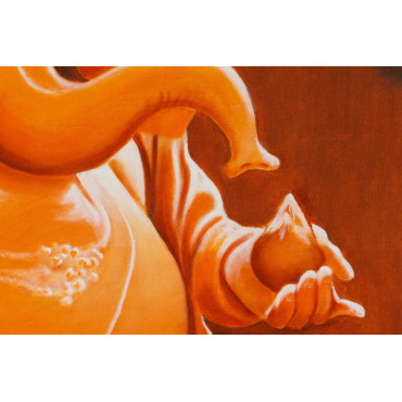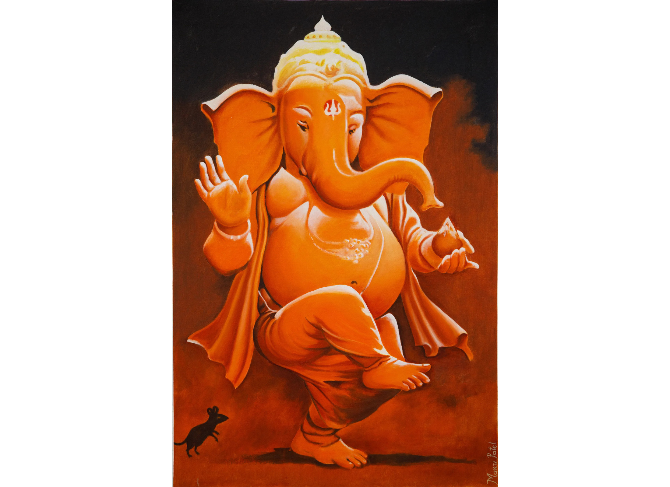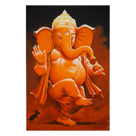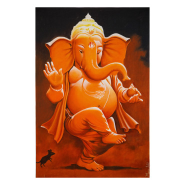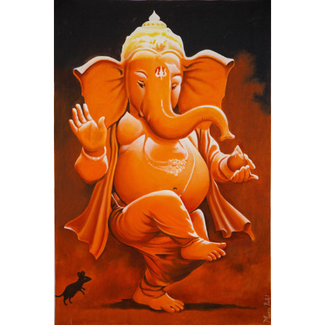 This exquisite canvas oil painting of Lord Ganesha in a graceful dance pose beautifully captures the essence of joy, divinity, and prosperity. Painted in warm shades of orange and golden hues, the artwork radiates positivity and spiritual charm. The detailed strokes highlight Ganesha’s majestic form, symbolic of wisdom, success, and good fortune, while his mouse companion adds a touch of devotion and completeness to the composition. The soothing background enhances the vibrant figure, making it a stunning centerpiece for your living room, meditation space, or office. This hand-painted masterpiece is not only a work of art but also a symbol of auspicious beginnings, perfect for gifting or personal collection. Bring home the blessings of Lord Ganesha with this unique oil painting that combines tradition with artistic elegance.