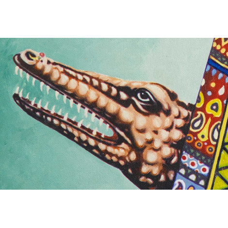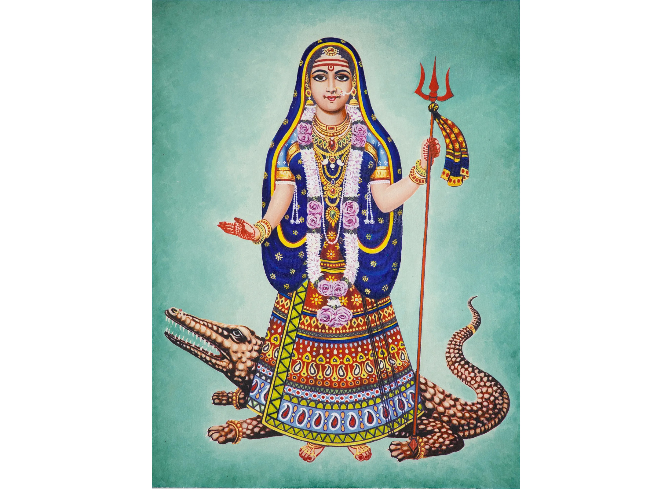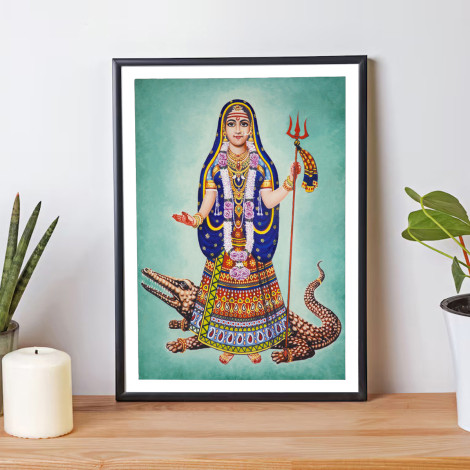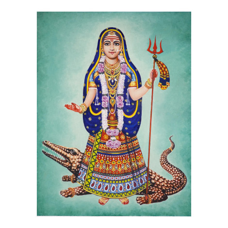 Bring divine grace and blessings into your home with this exquisite canvas oil painting of Khodiyar Maa (Maa Khodal), the revered goddess of strength, protection, and devotion. Meticulously hand-painted with rich detailing, this artwork beautifully captures Maa Khodal’s serene yet powerful presence, adorned with vibrant traditional attire, intricate jewelry, and holding the sacred trident. The goddess is depicted standing gracefully over her symbolic crocodile mount, signifying courage and divine power. The bright colors, delicate floral garlands, and fine brushwork add depth and radiance, making this painting a captivating centerpiece for your living room, meditation space, or temple decor. This artwork not only enhances the beauty of your interiors but also fills the surroundings with spiritual positivity, peace, and divine energy. A perfect choice for devotees, art collectors, or anyone seeking auspicious wall decor.