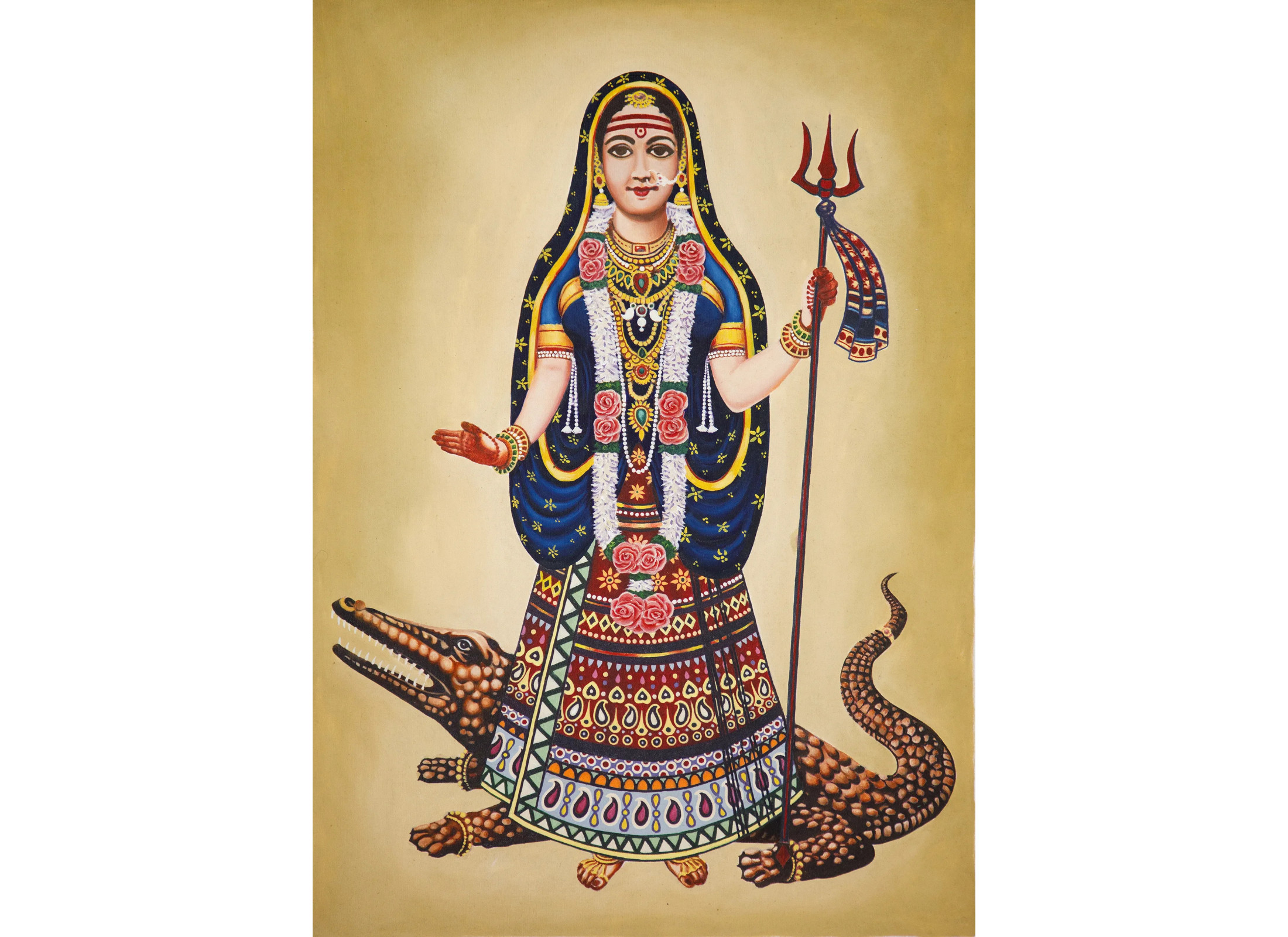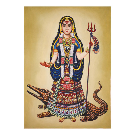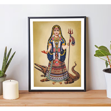 Bring divine grace and blessings into your home with this exquisite canvas oil painting of Khodiyar Maa (Maa Khodal), the revered goddess of strength, protection, and devotion. Meticulously hand-painted with rich detailing, this artwork beautifully captures Maa Khodal’s serene yet powerful presence, adorned with vibrant traditional attire, intricate jewelry, and holding the sacred trident. The goddess is depicted standing gracefully over her symbolic crocodile mount, signifying courage and divine power. The bright colors, delicate floral garlands, and fine brushwork add depth and radiance, making this painting a captivating centerpiece for your living room, meditation space, or temple decor. This artwork not only enhances the beauty of your interiors but also fills the surroundings with spiritual positivity, peace, and divine energy. A perfect choice for devotees, art collectors, or anyone seeking auspicious wall decor.