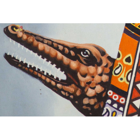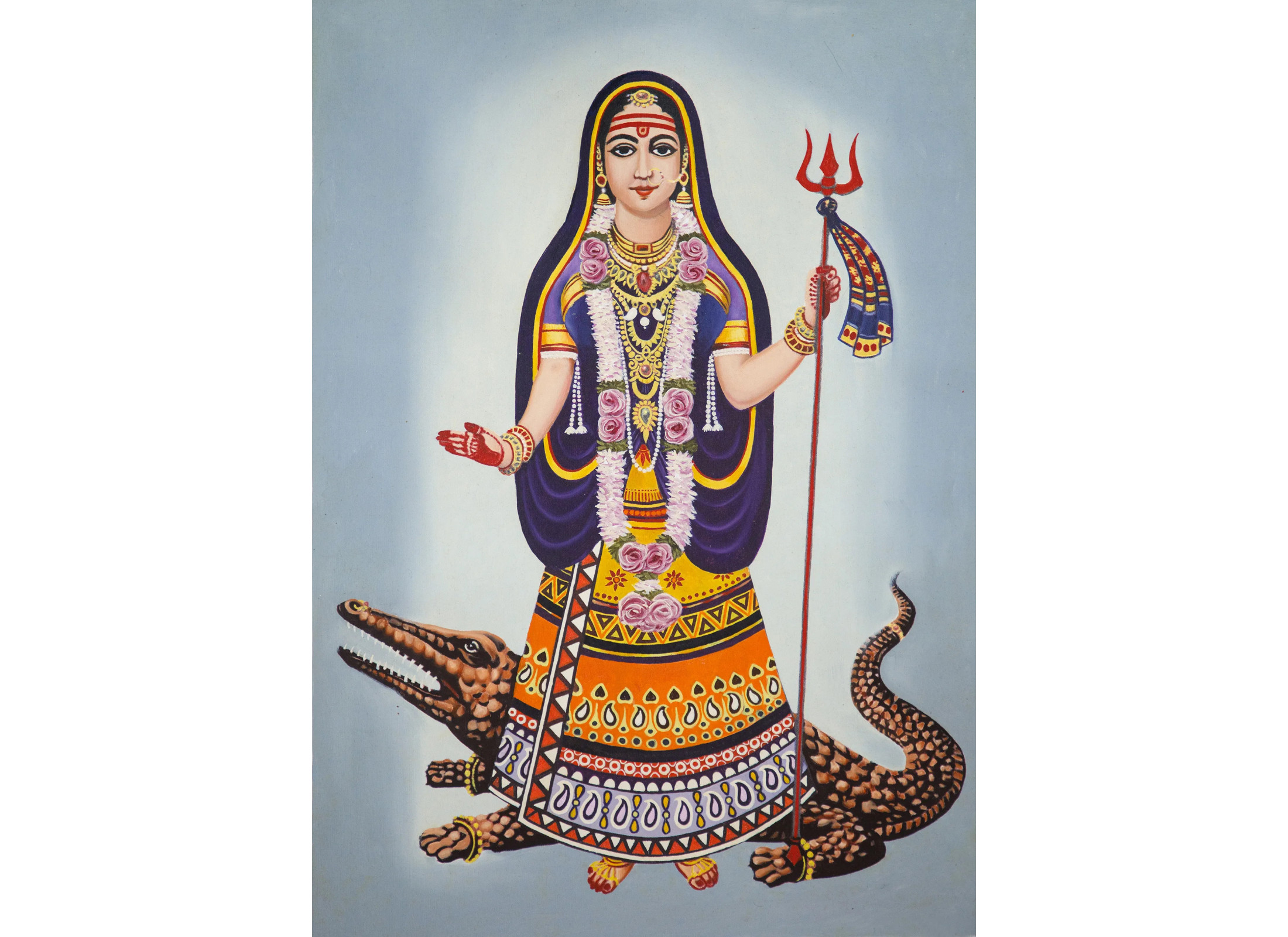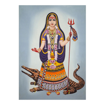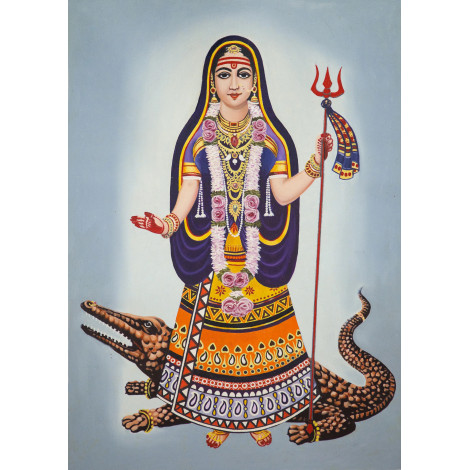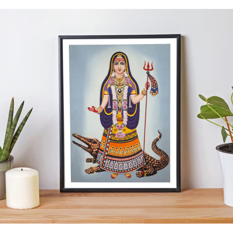 Bring divine grace and blessings into your home with this exquisite canvas oil painting of Khodiyar Maa (Maa Khodal), the revered goddess of strength, protection, and devotion. Meticulously hand-painted with rich detailing, this artwork beautifully captures Maa Khodal’s serene yet powerful presence, adorned with vibrant traditional attire, intricate jewelry, and holding the sacred trident. The goddess is depicted standing gracefully over her symbolic crocodile mount, signifying courage and divine power. The bright colors, delicate floral garlands, and fine brushwork add depth and radiance, making this painting a captivating centerpiece for your living room, meditation space, or temple decor. This artwork not only enhances the beauty of your interiors but also fills the surroundings with spiritual positivity, peace, and divine energy. A perfect choice for devotees, art collectors, or anyone seeking auspicious wall decor.