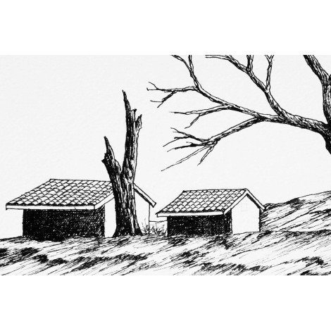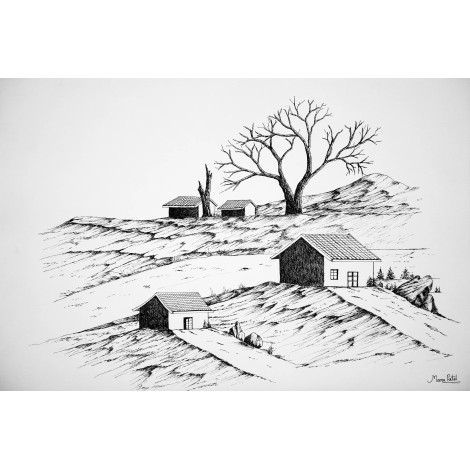 This beautiful linear sketch artwork captures the peaceful charm of a quiet countryside village. Featuring simple village huts nestled amidst rolling hills, winding paths, and bare trees, the painting reflects the rustic beauty of rural life. The detailed linework adds depth and texture, making the scene come alive with a raw yet tranquil energy. Its monochrome simplicity emphasizes purity and nostalgia, evoking the essence of untouched village landscapes. Perfect for those who appreciate minimalist art with deep emotional resonance, this artwork adds a serene, timeless touch to any living room, study, or office wall. It is not just a piece of art but a window into the soulful simplicity of traditional village life.