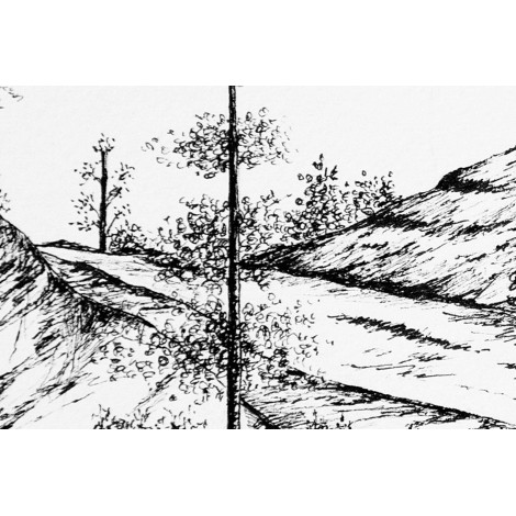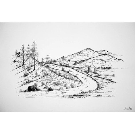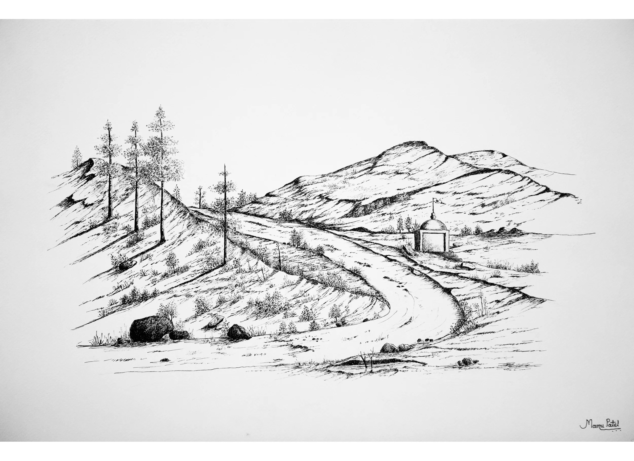 This beautiful linear sketch art captures the calm and timeless charm of a village landscape. The artwork portrays a winding road passing through gentle hills, surrounded by scattered trees and rustic natural beauty. A small village temple stands gracefully by the roadside, symbolizing peace and spirituality in rural life. The black and white pen strokes create a striking contrast, emphasizing depth, texture, and harmony in every detail. Perfect for art lovers who admire minimalist yet powerful sketches, this piece evokes nostalgia, serenity, and a connection to nature. Whether displayed in your living room, office, or art collection, this artwork brings a sense of tranquility and rustic elegance to any space.