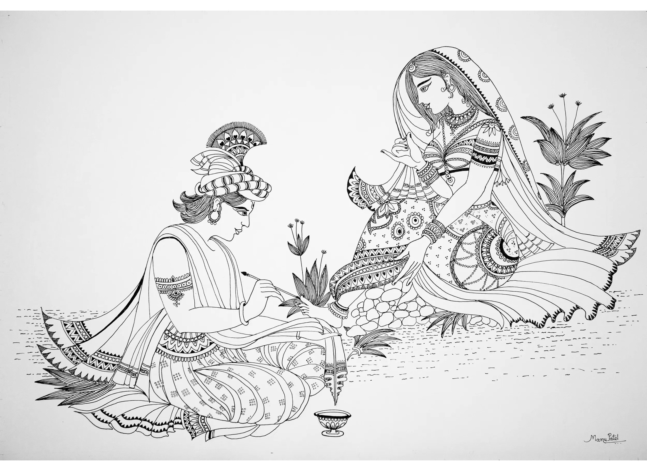 This exquisite linear sketch art captures the eternal bond of Radha and Krishna, symbolizing divine love, devotion, and harmony. The intricate detailing in every stroke brings out the spiritual elegance of this timeless duo, making it a perfect blend of tradition and artistry. Rendered in a fine black-and-white sketch style, the artwork reflects purity and serenity while highlighting delicate patterns that enhance its visual charm. Ideal for homes, offices, or spiritual spaces, this painting evokes a sense of peace and devotion while adding an artistic touch to your decor. A perfect choice for art collectors, spiritual seekers, and anyone who values Indian heritage and cultural aesthetics.