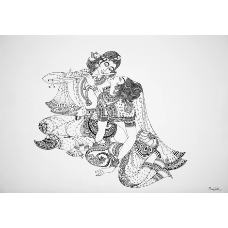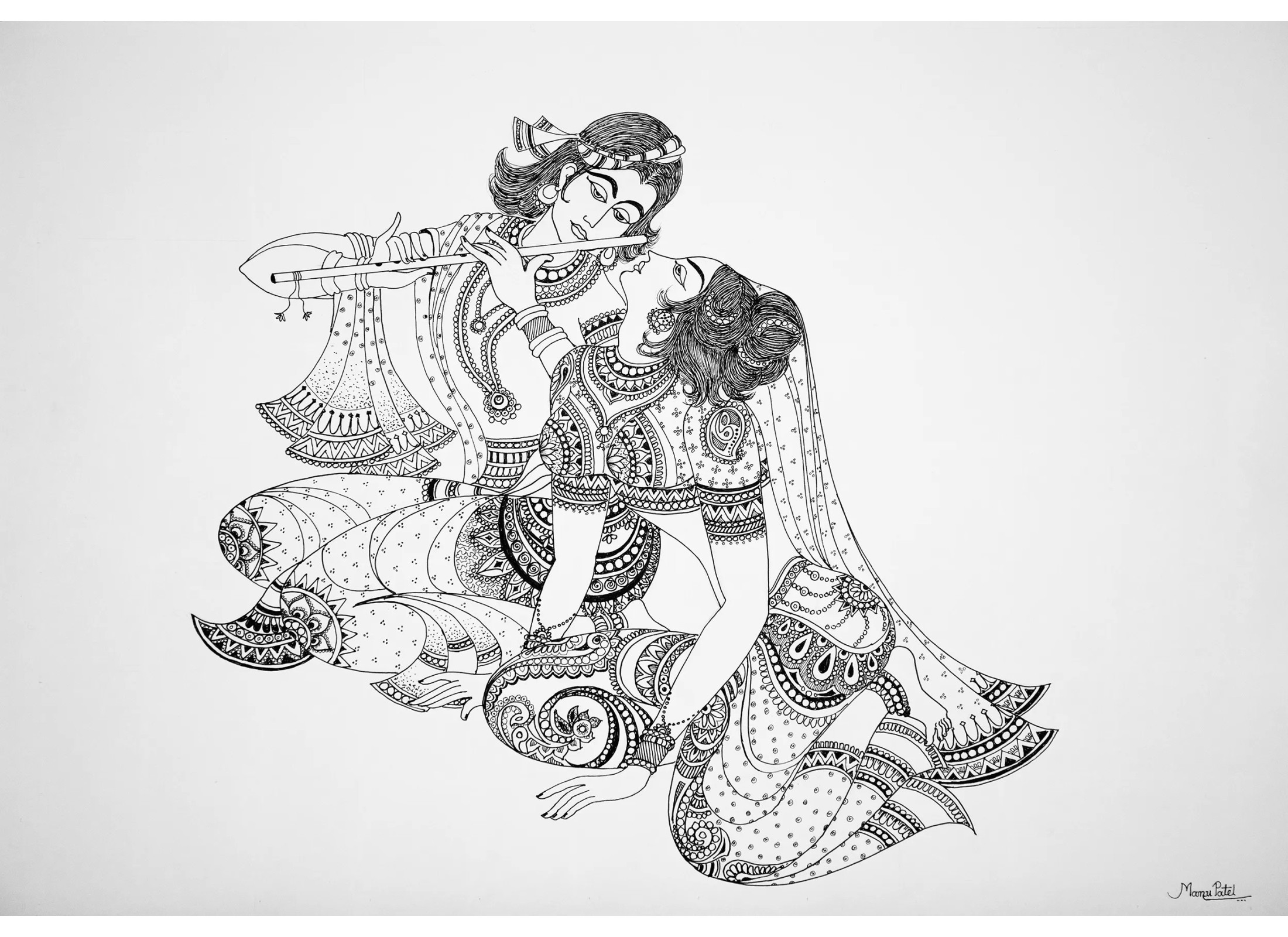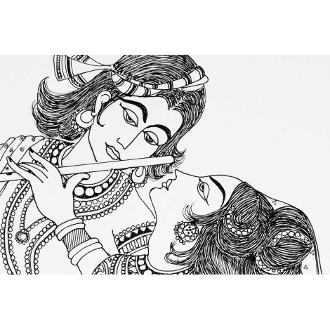 This exquisite linear sketch art beautifully portrays the divine love of Radha and Krishna, captured in intricate black-and-white detailing. The graceful lines and patterns highlight the purity, devotion, and eternal bond between the divine couple, symbolizing love beyond time and space. Hand-drawn with fine precision, this artwork blends traditional Indian artistry with a contemporary sketch style, making it a perfect piece for spiritual decor, meditation spaces, or elegant living rooms. The minimalistic yet richly detailed design creates a soothing and devotional ambiance, leaving viewers mesmerized by its timeless charm. Whether you are an art enthusiast or a devotee of Radha Krishna, this painting is a soulful addition to your collection.