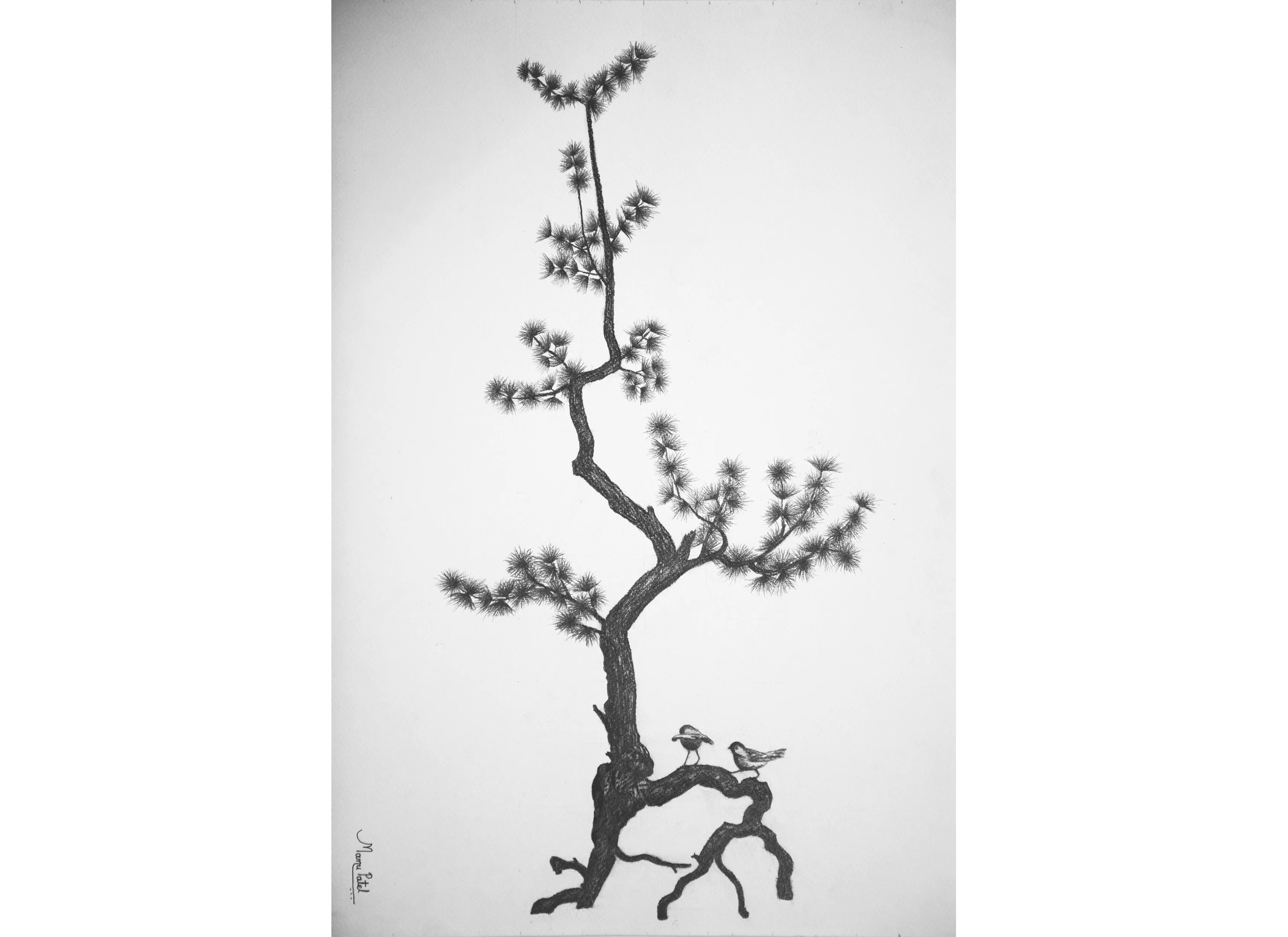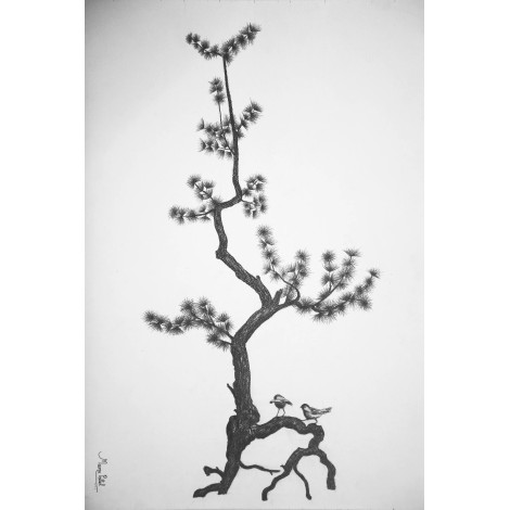 This elegant black-and-white sketch captures the timeless beauty of two little birds resting peacefully on a delicate tree branch. Created in a minimalist linear sketch style, the artwork evokes a sense of calm, harmony, and natural simplicity. The intricate detailing of the pine-like tree combined with the gentle presence of the birds symbolizes companionship, peace, and the quiet moments of life. Its monochrome palette makes it versatile and perfect for modern interiors, offices, or meditation spaces. This artwork not only enhances your wall decor but also brings a touch of serenity and grace to your living space. An ideal choice for art collectors and nature lovers alike, this sketch embodies the balance of life and nature in its purest form.